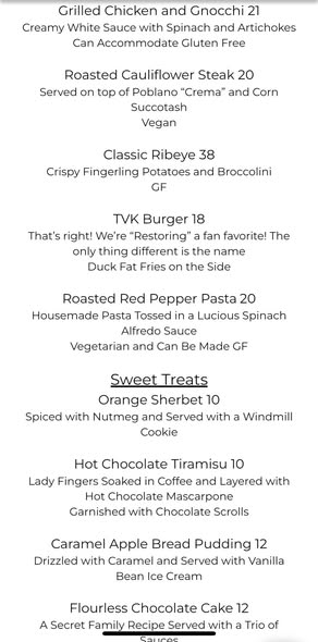 To start, diners can expect elevated takes on familiar dishes. The Grilled Chicken and Gnocchi features a creamy white sauce with spinach and artichokes, and it can be made gluten-free. Meanwhile, the Roasted Cauliflower Steak offers a flavorful vegan option served over poblano crema and corn succotash. Another standout is the TVK Burger, a revived favorite from the previous restaurant, now served with duck fat fries.